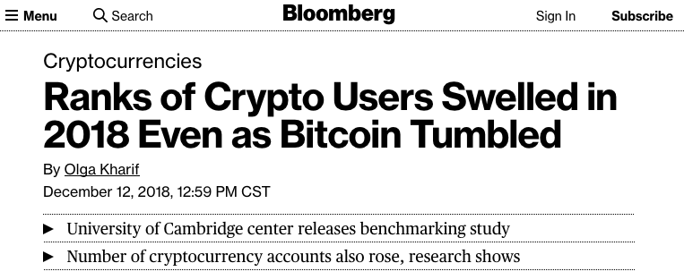 According to a study conducted by the Cambridge Center for Alternative Finance, the number of ID-verified cryptocurrency users nearly doubled in 2018, from 18 million, to 35 million, despite the bear market.