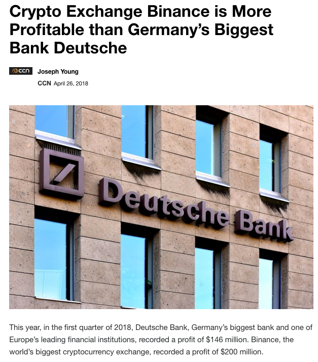 To put this number into context, the Binance crypto exchange produced $200 Million in 2018 Q1 profits, while Nasdaq produced $209 Million, and Dueutsche Bank brought in $146 million.